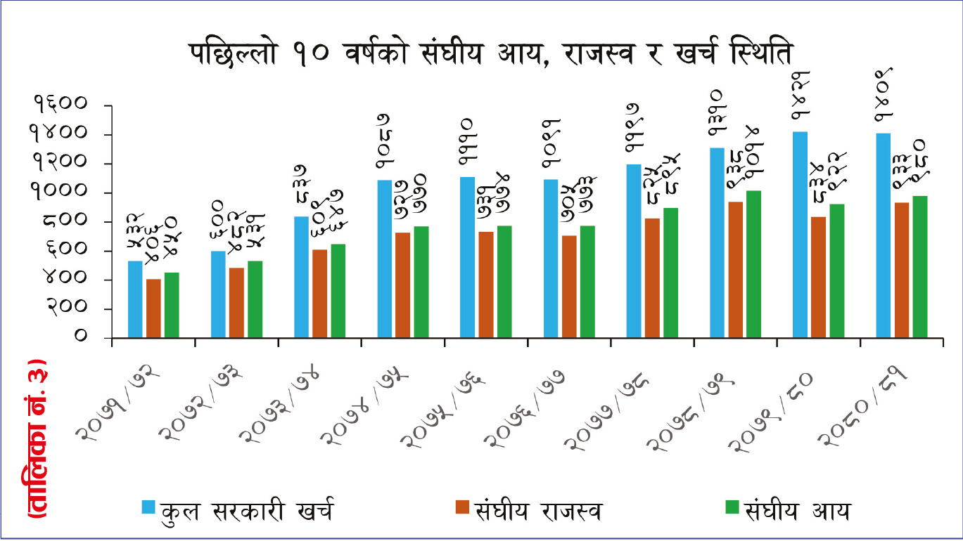 यस्तो किन भइरहेको छ भन्ने विषयमा पूर्वअर्थसचिव गोपीनाथ मैनाली भन्छन्, ‘पछिल्लो १० वर्षमा नेपालले राजनीतिक स्थायित्व, ऊर्जा उत्पादन र सामाजिक संरचनामा सुधारको प्रयास गरेको भए पनि उत्पादनशील क्षेत्रको विकास र आत्मनिर्भरता निर्माणमा धेरै चुनौतीहरू छन् । अबको प्राथमिकता दीर्घकालीन योजना र दिगो आर्थिक वृद्धि हुनुपर्छ तर राजनीतिक दलहरूले आर्थिक मुद्दालाई छायामा पारेर आफ्ना मुद्दालाई मात्र अघि सारेको देखिन्छ । जसले आम मानिसमा आत्मविश्वास खस्कँदै गएको हो ।’ (तालिका नं. ३)