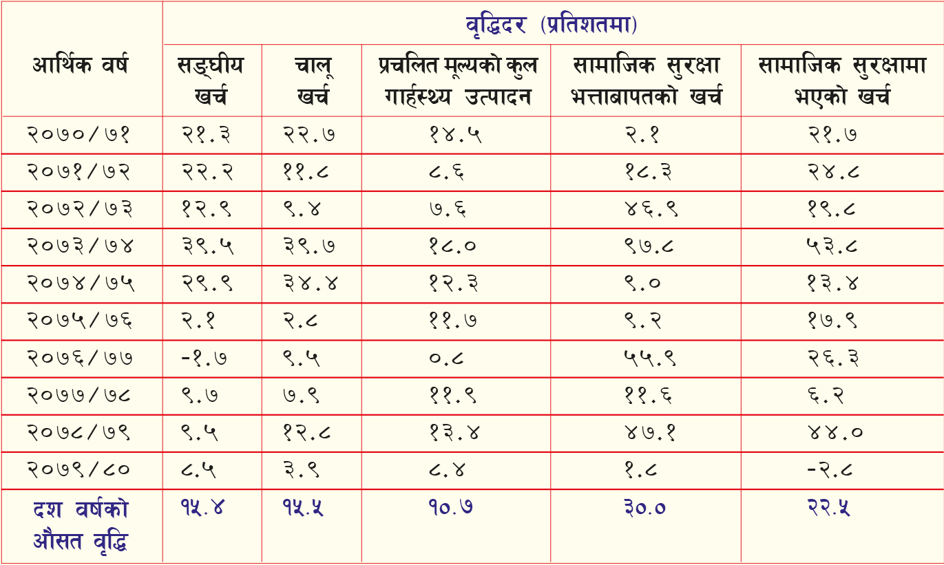 राज्यमा आर्थिक भार हरेक वर्ष थपिँदै गएको छ । सामाजिक सुरक्षा भत्ताबापतको भार यो एक दशकमा दोब्बर बढीले बढेको तथ्यांक छ । अर्थ मन्त्रालयका अनुसार १० वर्षमा सुरक्षा भत्ताबापत खर्चमा औसत वृद्धिदर ३० प्रतिशतसम्मले बढेको छ । सामाजिक सुरक्षामा भएको खर्च २२.५ प्रतिशतले बढेको छ । हरेक वर्ष राजस्वको आकार घट्दै जानु, ऋण थपिँदै जानु र सामाजिक सुरक्षा भत्ताको दायित्व बढ्दै जानुले आगामी दिनमा अर्थतन्त्र थप संकटतर्फ जाने त होइन भन्ने डर देखिन्छ ।