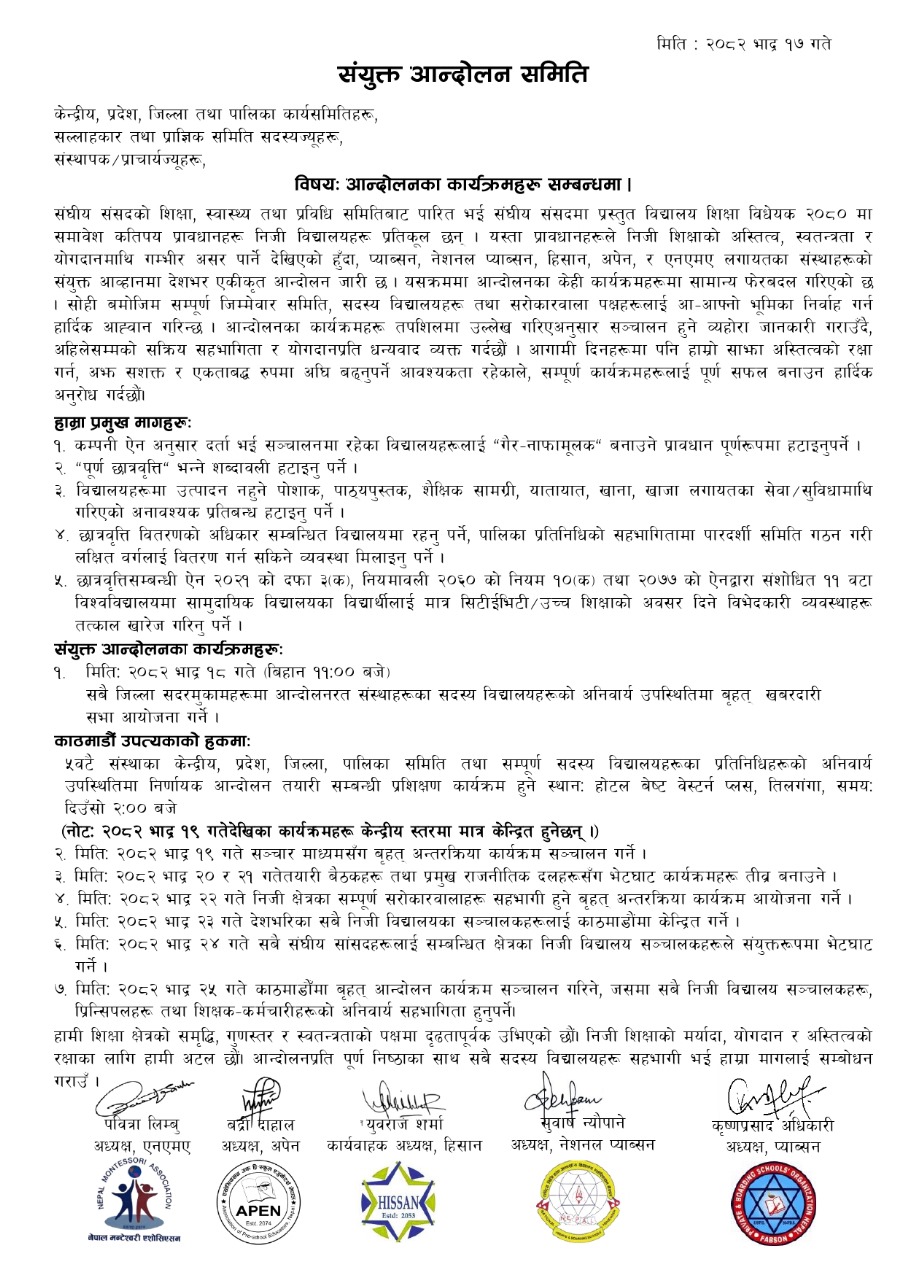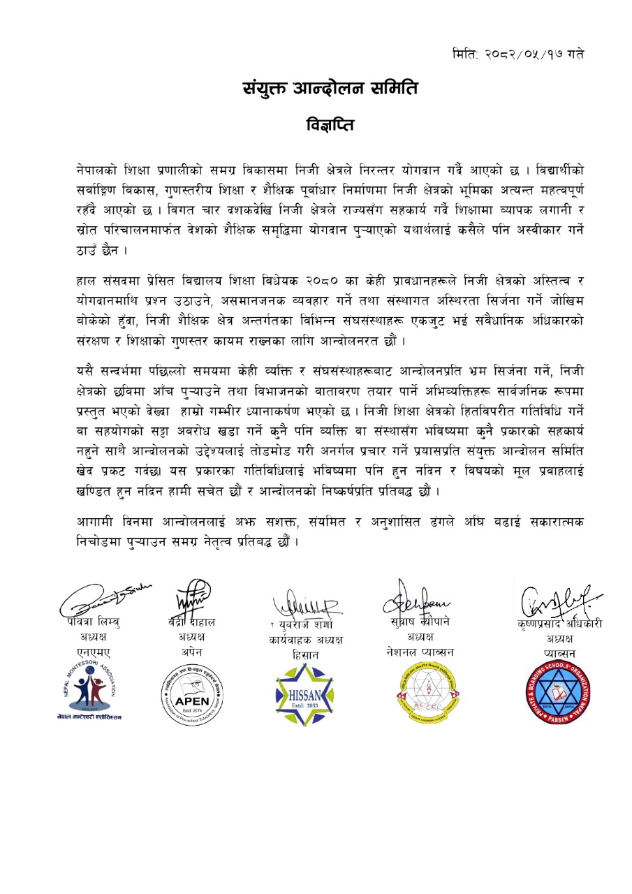 विज्ञप्ति जारी गर्दै आन्दोलनलाई संयमित, अनुशासित र सशक्त ढंगले अघि बढाउने प्रतिबद्धता जनाएका छन्। समितिले शिक्षा क्षेत्रको समृद्धि, गुणस्तर र स्वतन्त्रताको पक्षमा आफूहरू दृढतापूर्वक उभिएको र