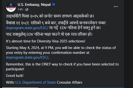 वैशाख २२ गते राति ९ बजेबाट आफ्नो कन्फरमेसन नम्बर dvprogram.state.gov/ESC मा गई नतिजा हेर्न सक्ने दूतावासले जनाएको छ ।