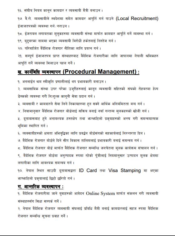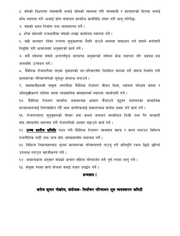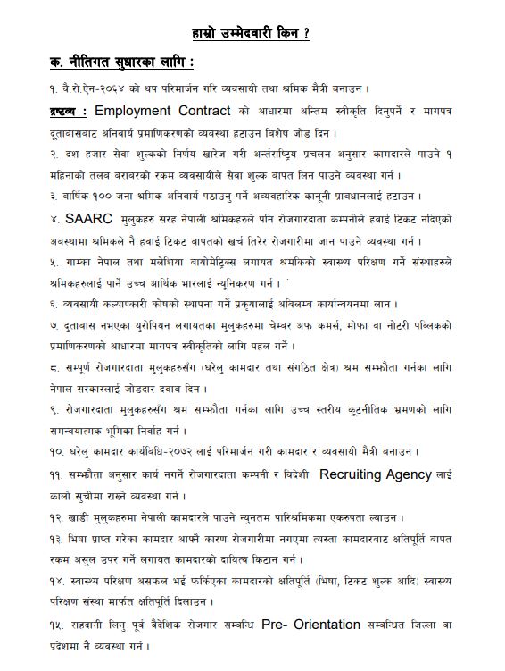 अध्यक्षमा उम्मेद्वार भण्डारीले आफु अध्यक्ष भएमा वैदेशिक रोजगार ऐन–२०४२, वैदेशिक रोजगार नियमावली–२०५६, न्यूनतम लागत शुल्क–२०७२, घरेलु कामदार कार्यबिधि २०७२ का बिभिन्न अव्यवहारिक सरकारी एवम् प्रशासनिक निर्णयहरु संशोधन गर्ने बताए ।