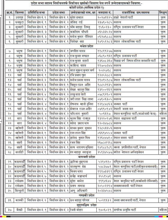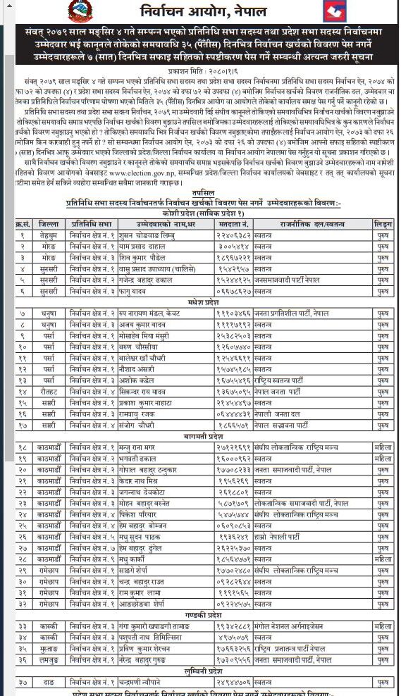 काठमाडौँ । गत मङ्सिर ४ गते सम्पन्न प्रतिनिधि र प्रदेश सभा निर्वाचनको खर्च विवरण पेस नगर्ने उम्मेदवारको नाम सार्वजनिक भएको छ ।