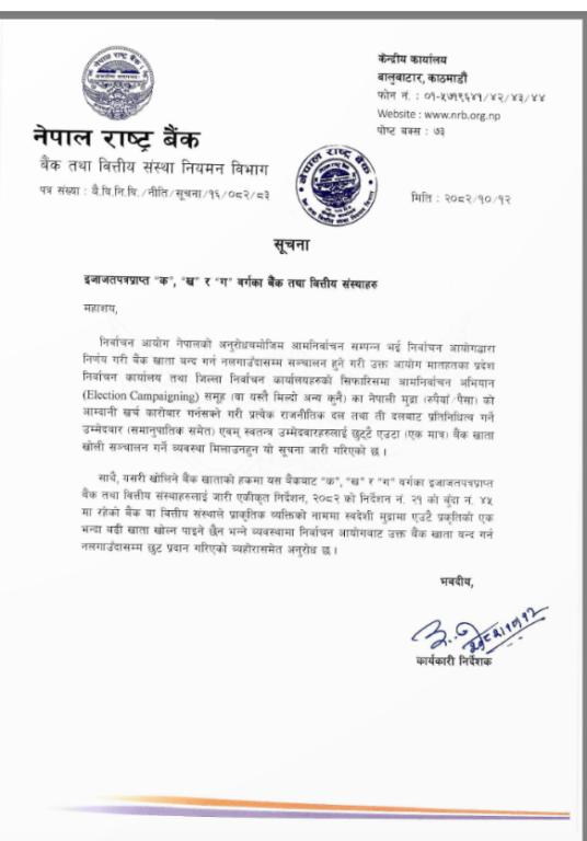 निर्वाचन आयोगको अनुरोधमा सोमबार जारी परिपत्रअनुसार निर्वाचन अभियानका लागि खोलिने बैंक खातामा विशेष छुट लागू हुनेछ ।