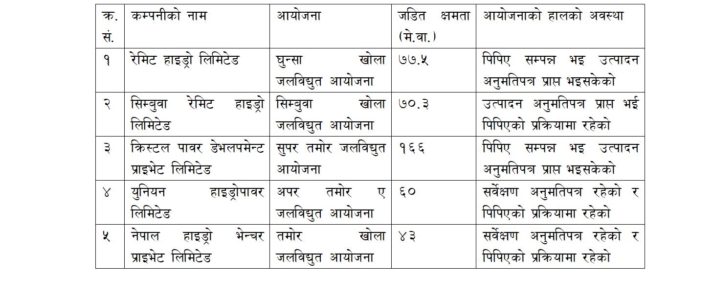 सरकारको यही मान्यताअनुरूप राष्ट्रिय प्रसारण ग्रिडले आफूले अध्ययन गरी तयारीमा रहेका आयोजनामध्ये तमोर-धुन्गेसान्घु २२० केभी प्रसारण लाइनलाई सार्वजनिक-निजी लगानीमार्फत बूट मोडेलमा निर्माण गर्न लागेको हो, जसअनुरूप आरपीजीसीएलसहित निम्नानुसारका उत्पादक कम्पनीहरू स्वपुँजी लगानीमा सहभागी हुनेछन् :