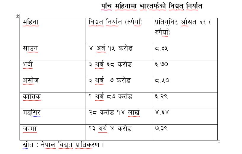 नेपाल विद्युत प्राधिकरणले चालू आवको साउन, भदौ असोज, कात्तिक र मङ्सिरमा देशभित्र खपत गरी अतिरिक्त भएको वर्षायामको १ अर्ब ७६ करोड युनिट विद्युत् भारततर्फ निर्यात गरेको छ । चार महिनामा भारततर्फ निर्यात गरिएको विद्युत्को औसत दर प्रतियुनिट ७ रुपैयाँ ३९ पैसा छ ।