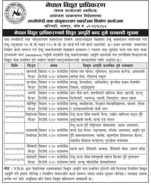 शुक्रबार एक विज्ञप्ति जारी गर्दै प्राधिकरणले लप्सीफेदी तथा चाँगुनारायण सबस्टेसन निर्माण आयोजनाद्वारा विद्यमान टेकु सबस्टेसन स्तरोन्नती गरी टेकू–स्युचाटार ६६ केभी लाइन १३२ केभी मा चार्ज गर्ने काम भएकोले बन्द गर्ने लागेको जानकारी दिएको हो ।