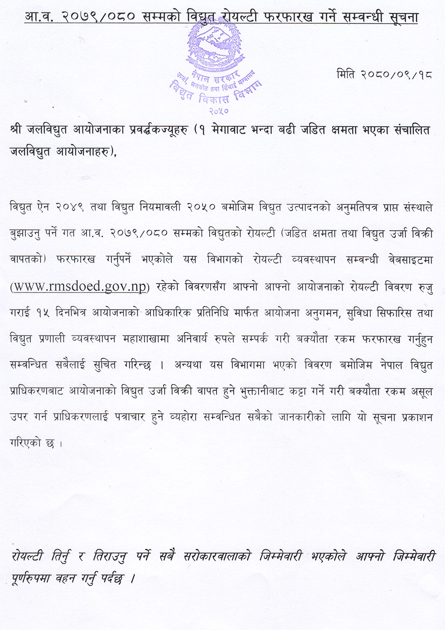 विद्युत् विकास विभागले बुधबार एक सूचना जारी गर्दै आर्थिक वर्ष २०७९८० सम्मको विद्युत् रोयल्टी फरफारख गर्न १५ दिनको समयावधि दिइएको हो ।