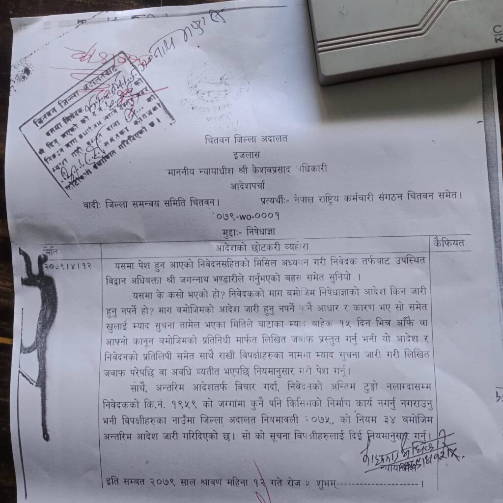 काठमाडौँ । जिल्ला समन्वय समिति चितवनको जग्गा हडपेर भवन निर्माण गरेको मुद्दामा चितवन जिल्ला अदालतले तत्काल निर्माण कार्य रोक्न अन्तरिम आदेश दिएको छ । माओवादी केन्द्र निकटको नेपाल राष्ट्रिय कर्मचारी संगठन चितवनले जिससको जग्गा हडपेर भवन निर्माण थालेपछि जिससले मुद्दा दर्ता गरेको थियो ।