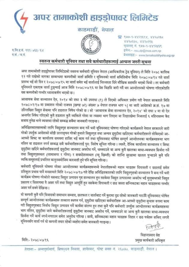 कम्पनीले तिहार र छठपछि वार्तामार्फत समस्या समाधानका लागि फेरि पहल थाल्ने विज्ञप्तिमार्फत बताएको छ ।