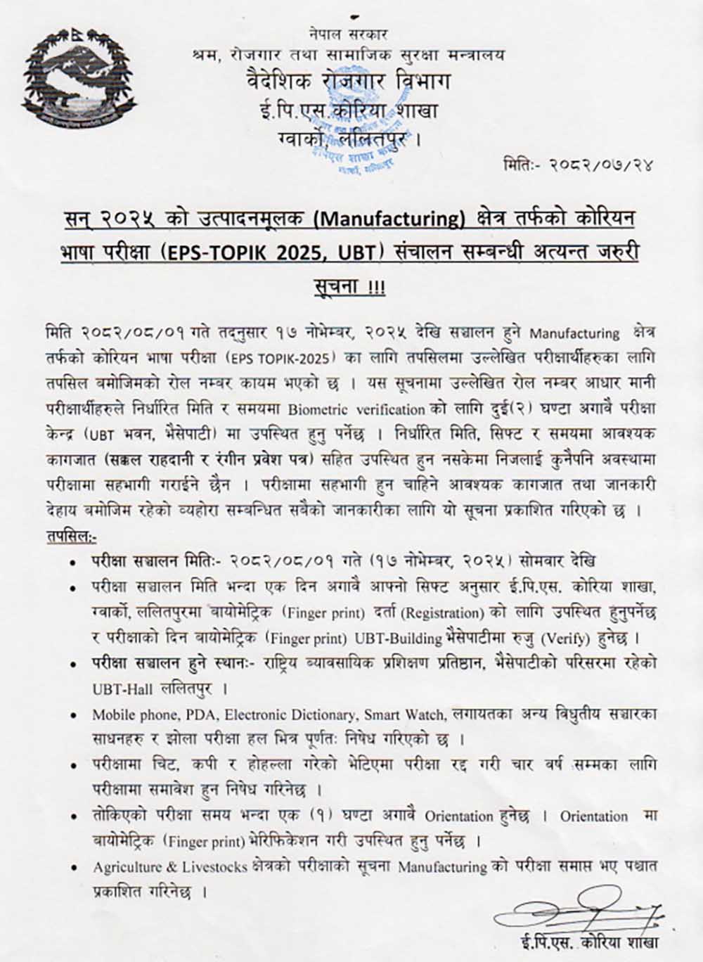 तर, कोरियामा कामदारको माग अनुसार उत्तीर्ण संख्या थपघट हुन सक्नेछ । एक दिनमा बढीमा ५ सिफ्ट गरी परीक्षा सञ्चालन हुने शाखाले जानकारी दिएको छ ।