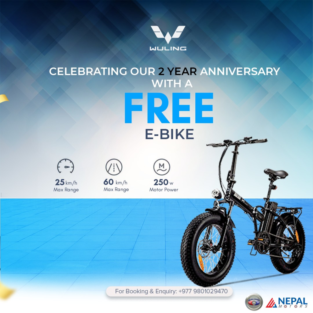 काठमाडौं । नेपालमा ३१ बर्ष देखी बिक्रि गर्दै आएको विश्वको प्रसिद् ब्राण्ड बज्र ग्रुप अन्तर्गतको वुलिंग एयर इ भी किन्दा १ लाख १५ हजारकाे इलेक्ट्रिक साइकल उपहार पाउने भएको छ । वुलिंग एयर सञ्चालनमा आएको दुईवर्ष पुग्नै लाग्दा यो अफर ल्याएको कम्पनीले जनाएको छ ।