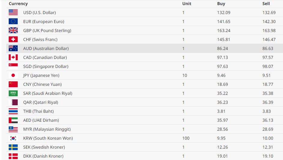 आज अमेरिकी डलर एकको खरिद दर १३२.०९ रुपैयाँ रहेको छ भने बिक्री दर १३२.६९ रुपैयाँ रहेको छ । युरोपियन युरो एकको खरिद दर १४१.६५ रुपैयाँ, बिक्री दर १४२.३० रुपैयाँ रहेको छ ।