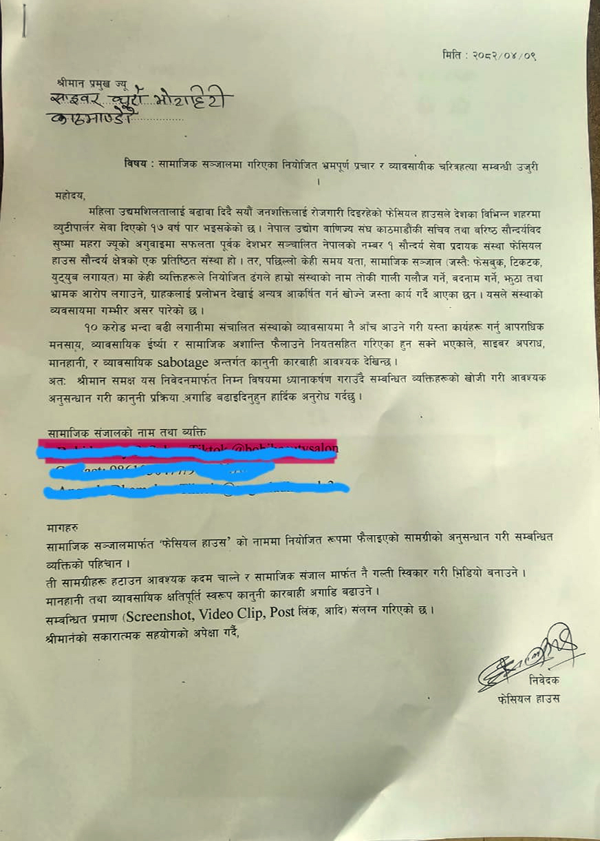 काठमाडौं । देशभर सौन्दर्य सेवा प्रदान गर्दै आएको नेपालकै ‘नम्बर १’ युनिसेक्स ब्युटी सलुन ‘फेसियल हाउस’ ले आफ्नो नाम र प्रतिष्ठामा आँच पुग्ने गरी भ्रामक प्रचार सामग्री बनाइ सामाजिक सञ्जालमा पोष्ट गर्नेहरूविरुद्ध साइबर ब्युरोमा उजुरी दर्ता गरेको छ ।