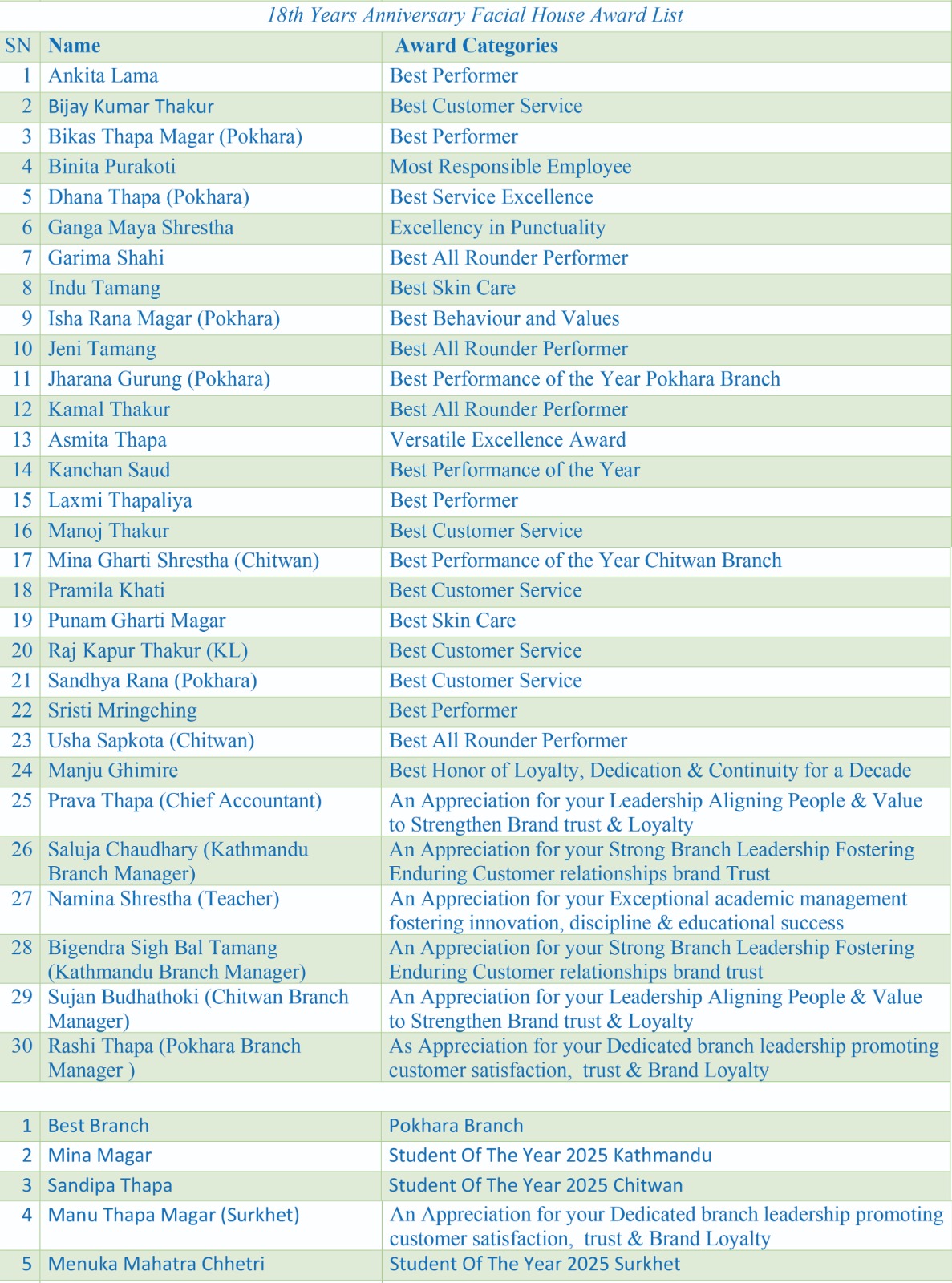 गौरवमय १७ वर्ष पूरा गरी १८औँ वर्ष प्रवेशको अवसरमा फेसियल हाउसले बिहीबार काठमाडौंको त्रिपुरेश्वरस्थित बोगेनभिल्ला इभेन्टमा भव्य समारोह आयोजना गरी आफ्नो वार्षिकोत्सव मनाएको छ । प्रतिनिधि सभाकी उपसभामुख इन्दिरा रानाको प्रमुख आतिथ्यतामा आयोजित समारोहमा विभिन्न शीर्षकमा उत्कृष्ट ३१ जना कर्मचारी र उत्कृष्ट एउटा शाखालाई अवार्ड प्रदान गरिएको छ । यस्तै, उत्कृष्ट तीन जना विद्यार्थीलाई पनि अवार्ड प्रदान गरिएको छ ।