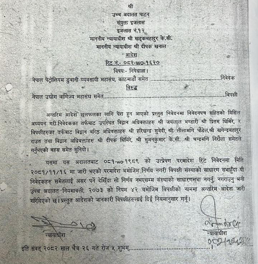 नेपाल पेट्रोलियम ढुवानी व्यवसायी महासंघले दायर गरेको निवेदनमाथि सुनुवाइ गर्दै अदालतले यस्तो आदेश जारी गरेको हो । निवेदकको माग अनुसार प्रारम्भिक रुपमा गम्भीर विषय देखिएको भन्दै संयुक्त इजलासका न्यायाधीशहरू खड्क बहादुर केसी र दीपक खनालले यस्तो आदेश जारी गरेका हुन् ।