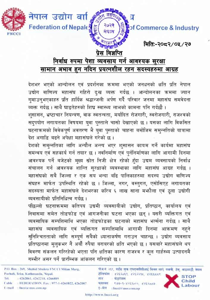 पछिल्लो घटनाक्रममा कतिपय उद्यमी व्यवसायीको उद्योग, प्रतिष्ठान, कार्यालय एवं निवासमा समेत तोडफोड एवं आगजनीका घटना भएको र त्यसबाट अर्बौँ रूपैयाँ बराबरको क्षति भएको महासंघको अनुमान छ । यसबारे महासंघले थप विवरण सङ्कलन गरिरहेको भए पनि क्षतिका कारण राजस्व र कुल गार्हस्थ्य उत्पादनमै गम्भीर असर पर्ने प्रारम्भिक आकलन गरिएको विज्ञप्तिमा उल्लेख छ ।