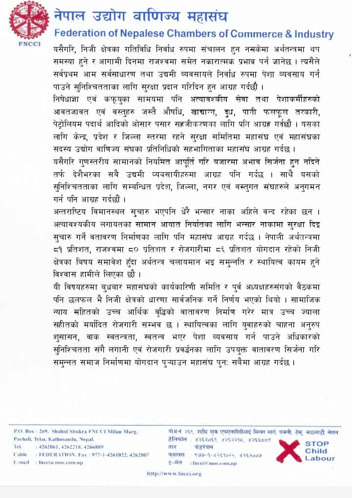 ‘निषेधाज्ञा एवम् कर्फ्युका सामयमा पनि अत्यावश्कीय सेवा तथा पेशाकर्मीहरूको आवतजावत एवम् वस्तुहरू जस्तै औषधि, खाद्यान्न, दुध, पानी फलफूल तरकारी, पेट्रोलियम पदार्थ आदिको ओसारपसार सहजीकरणका लागि पनि आग्रह गर्दछौँ,’ महासंघले विज्ञप्तिमार्फत भनेको छ, ‘यसका लागि केन्द्र, प्रदेश र जिल्ला स्तरमा रहने सुरक्षा समितिमा महासंघ एवम् महासंघका सदस्य उद्योग वाणिज्य संघका प्रतिनिधिको सहभागिताका महासंघ आग्रह गर्दछ ।’