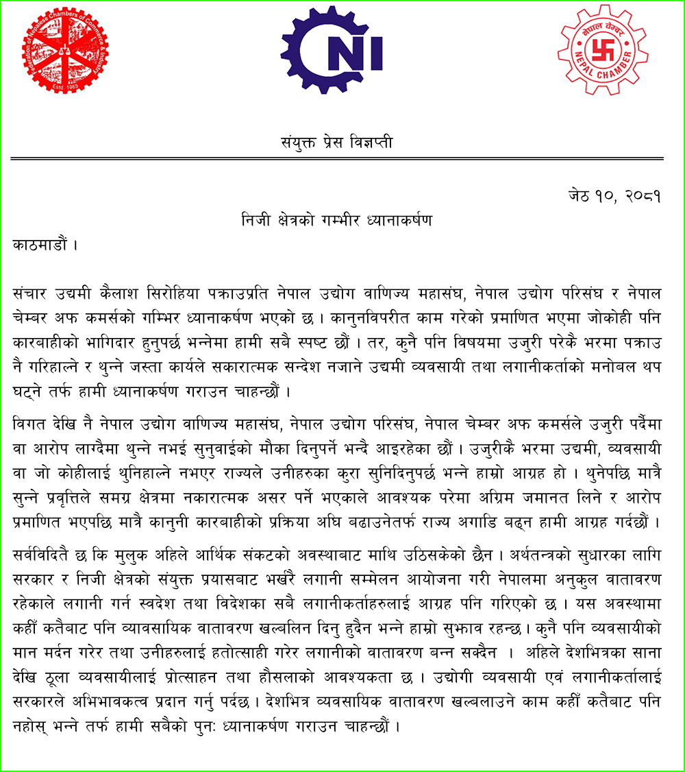 ‘सञ्चार उद्यमी कैलाश सिरोहिया पक्राउप्रति नेपाल उद्योग वाणिज्य महासंघ, नेपाल उद्योग परिसंघ र नेपाल चेम्बर अफ कमर्सको गम्भीर ध्यानाकर्षण भएको छ । कानुनविपरीत काम गरेको प्रमाणित भएमा जोकोही पनि कारबाहीको भागिदार हुनुपर्छ भन्नेमा हामी सबै स्पष्ट छौँ । तर, कुनै पनि विषयमा उजुरी परेकै भरमा पक्राउ नै गरिहाल्ने र थुन्ने जस्ता कार्यले सकारात्मक सन्देश नजाने उद्यमी व्यवसायी तथा लगानीकर्ताको मनोबल थप घट्नेतर्पm हामी ध्यानाकर्षण गराउन चाहन्छौं,’ विज्ञप्तिमा भनिएको छ ।