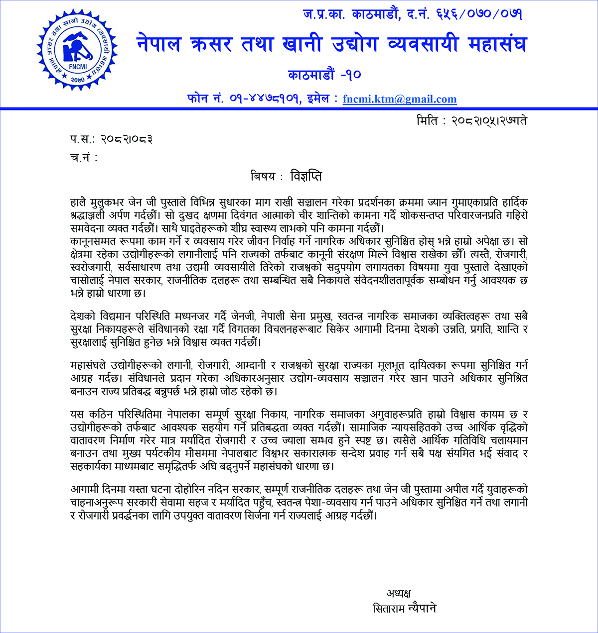 देशको विद्यमान परिस्थितिमा जेनजी, नेपाली सेना प्रमुख, स्वतन्त्र नागरिक समाजका अगुवाहरू तथा सुरक्षा निकायहरू संविधानको रक्षा गर्दै आगामी दिनमा शान्ति, स्थायित्व र समृद्धि सुनिश्चित गर्ने विश्वास समेत महासंघले प्रकट गरेको छ ।