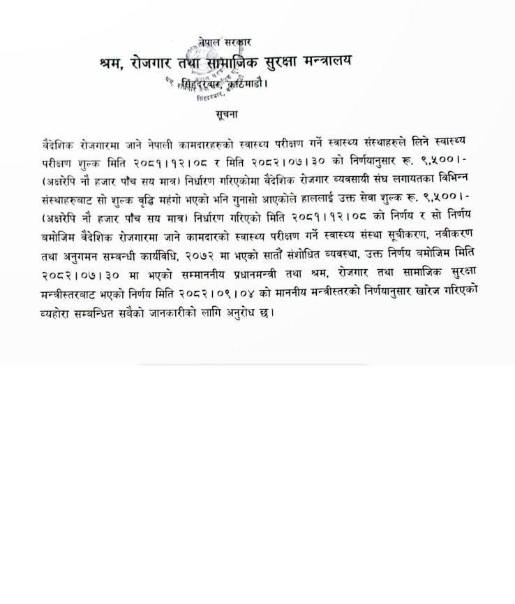 काठमाडौं । वैदेशिक रोजगारीमा जानेहरूको स्वास्थ्य परीक्षण शुल्क वृद्धि खारेज गरिएको छ । श्रम, रोजगार तथा सामाजिक सुरक्षा मन्त्री राजेन्द्रसिंह भण्डारीले शुल्क वृद्धि खारेज गर्दै पुरानै यथावत् गराएका हुन् ।