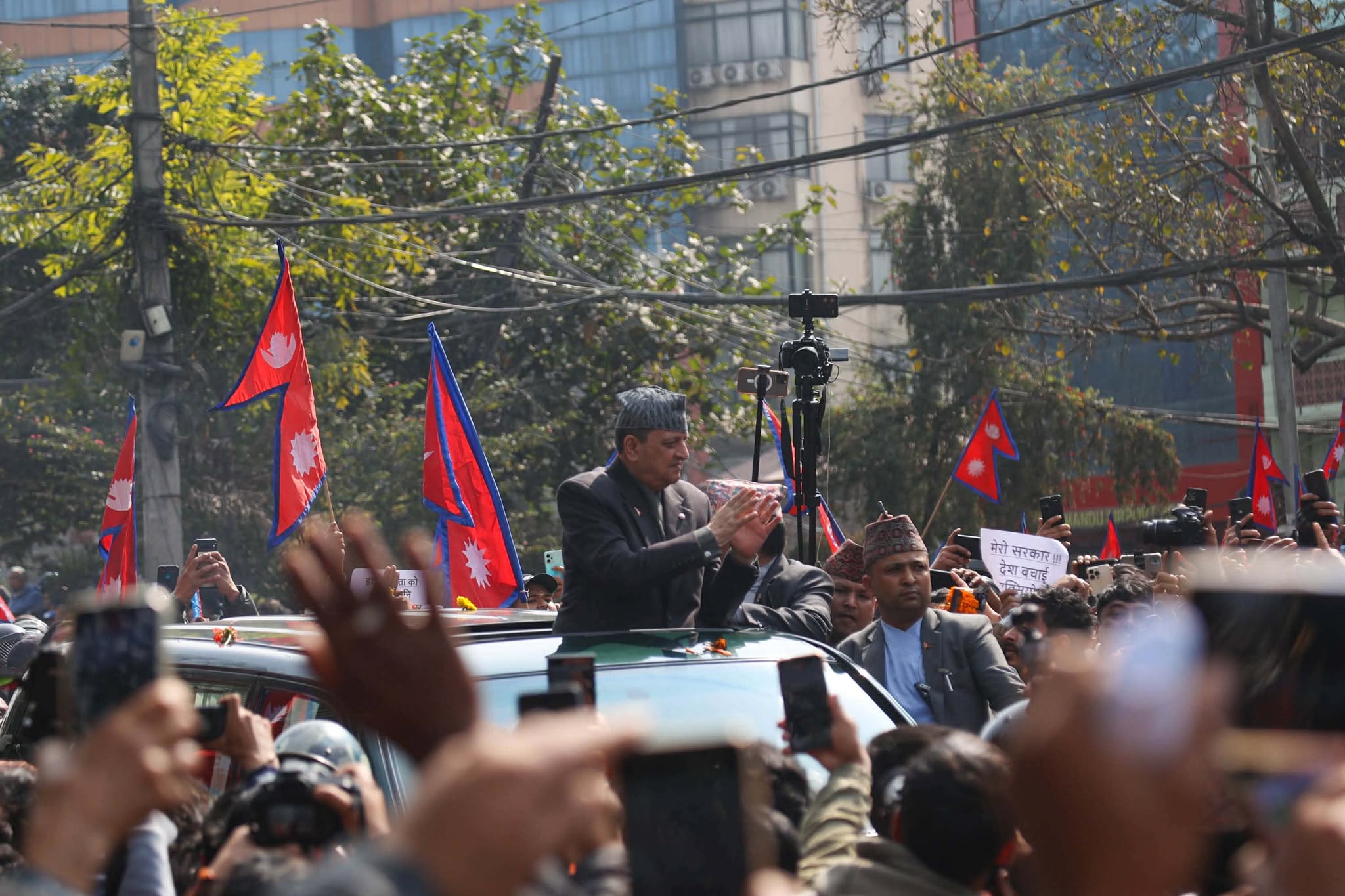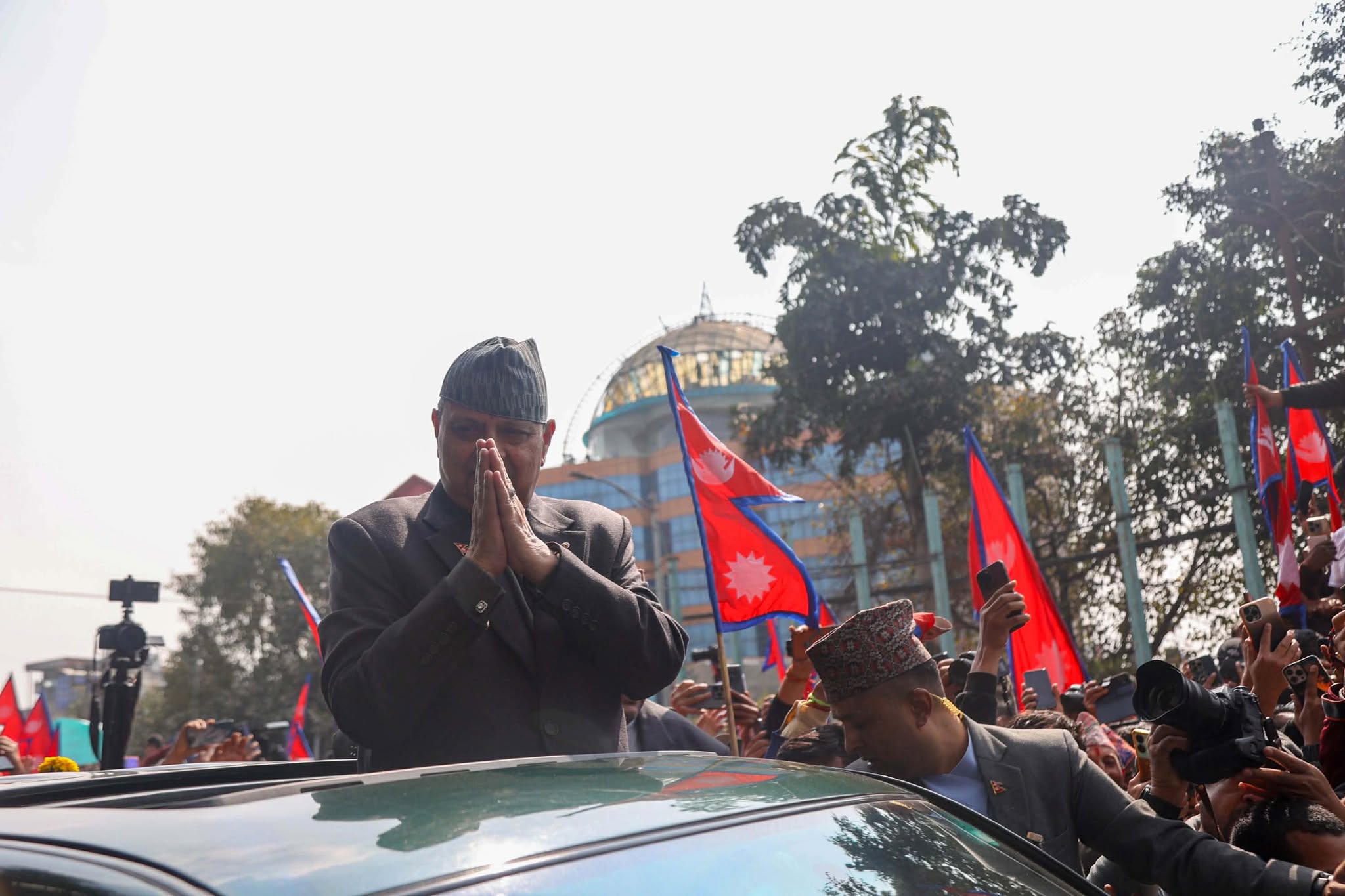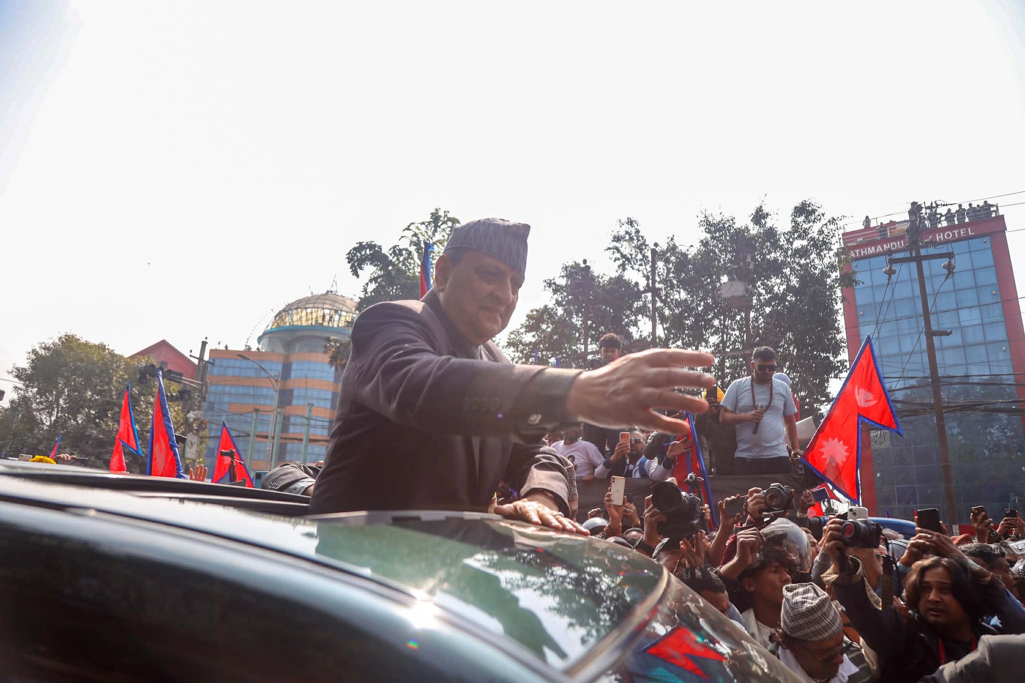 उनलाई समर्थकहरूले विभिन्न नारासहित विमानस्थल गेटबाट स्वागत गरेका छन् । उनले गाडीबाट समर्थकहरूलाई हात हल्लाउँदै धन्यवाद दिएका छन् ।