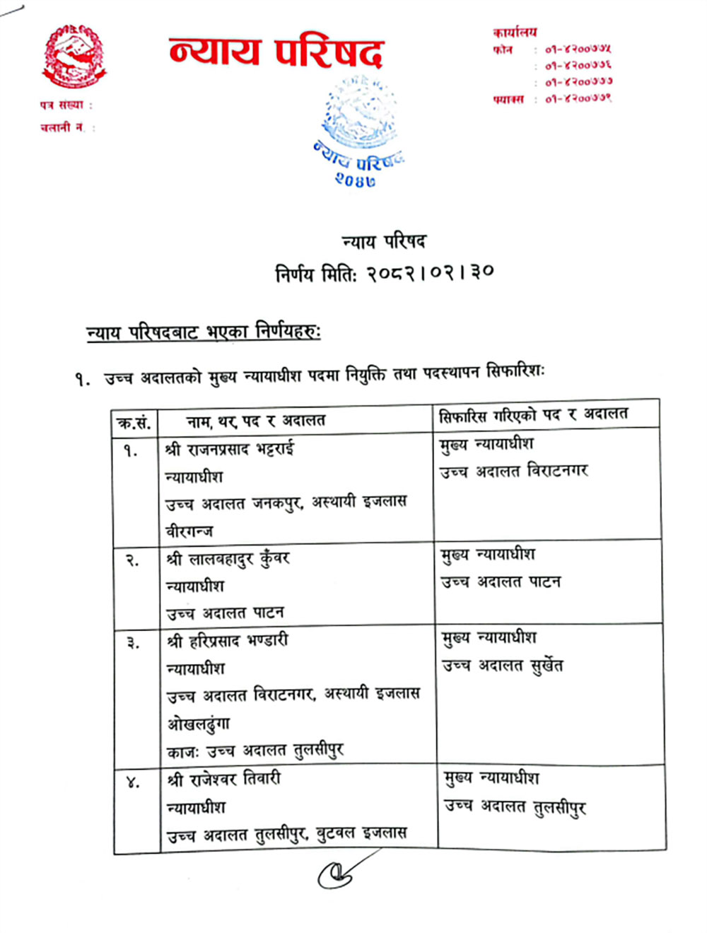 त्यसैगरी, उच्च अदालत तुलसीपुरको बुटवल इजलासका न्यायाधीश राजेश्वर तिवारीलाई सोही अदालतको मुख्य न्यायाधीशमा नियुक्त गर्न सिफारिस गरिएकाे छ ।