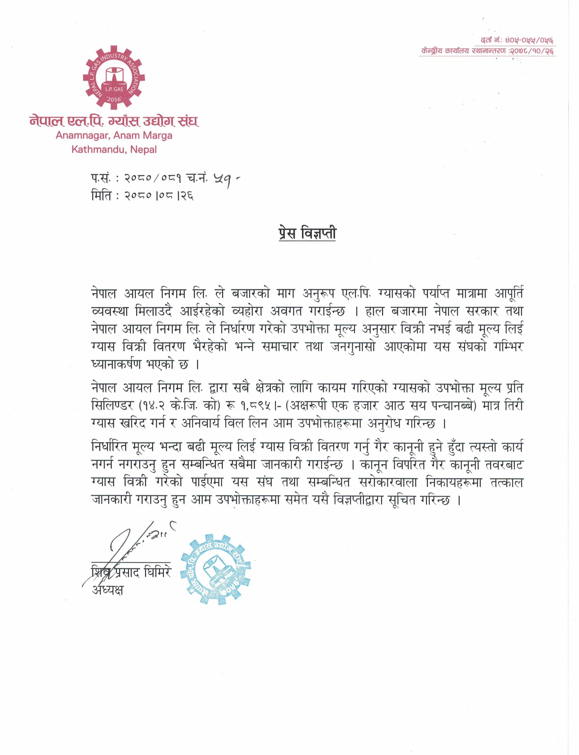 आज मंगलबार एक विज्ञप्ति जारी गर्दै संघले बजारमा सरकारले तोकेको भन्दा बढी मूल्य लिएर ग्यास किनबेच भइरहेको गुनासो तथा सामाचारहरू आइरहेको भन्दै बढी मूल्य नतिर्न र ग्यास किन्दा बिल अनिवार्य लिन अनुरोध गरेको हो ।