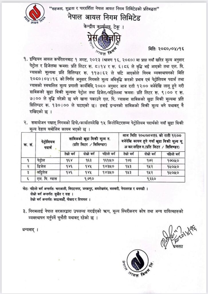 पेट्रोल ९ रुपैयाँ र डिजेल तथा मट्टितेलको मूल्य प्रतिलिटर ७ रुपैयाँले बढाएको छ । पेट्रोल प्रतिलिटर १७३ रुपैयाँ र डिजेल र मट्टितेल १५३ रुपैयाँ पुगेको छ । हवाई इन्धनको मूल्य यथावत रहेको निगमले जनाएको छ । आज राति १२ बजेदेखि यो मूल्य लागू हुने छ ।