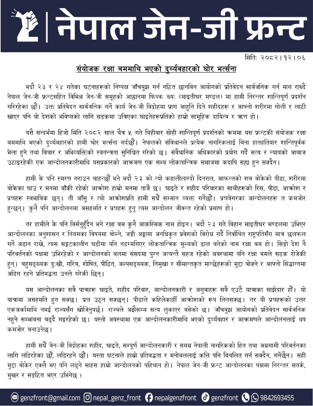 संवैधानिक अधिकारको प्रयोग गर्दै सत्य र न्यायको आवाज उठाइरहेकी एक आन्दोलनकारीमाथि यसप्रकारको आक्रमण एक सभ्य लोकतान्त्रिक समाजमा कदापि सह्य हुन सक्दैन।’