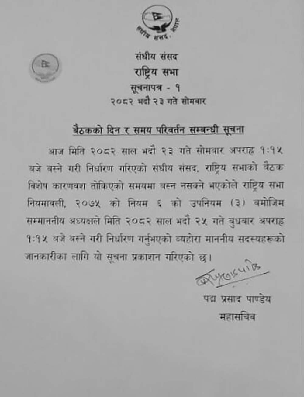 काठमाडौँ । आज बस्ने भनिएको राष्ट्रिय सभाको बैठक स्थगित भएको छ । संघीय संसद सचिवालयले सूचना जारी गर्दै आज १स् १५ बजे बस्ने तालिका रहेको राष्ट्रिय सभाको बैठक बुधबार अपराहन्न १स् १५ बजे बस्ने जानकारी दिएको छ ।