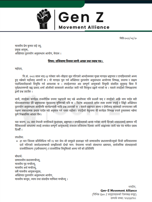 काठमाडौँ । जेनजी मुभमेन्ट अलायन्स, विभिन्न जेनजीहरुको एक समूहले अख्तियार दुरुपयोग अनुसन्धान आयोगका प्रमुख आयुक्त प्रेमकुमार राईसहित सबै आयुक्तहरूको तत्काल स्वेच्छिक राजीनामा माग गरेको छ ।