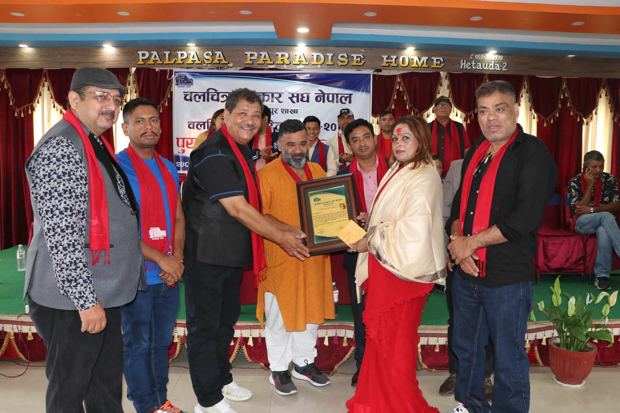 चलचित्र पत्रकार संघ नेपाल मकवानपुर शाखाले चलचित्र पत्रकारिता दिवसको अवसर पारेर हिजो बिहीबार आयोजना गरेको विशेष समारोहबीच नगद राशीसहित ‘नन्दबहादुर महर्जन स्मृति राष्ट्रिय चलचित्र पत्रकारिता पुरस्कार–२०८१’ प्रदान गरिएको हो ।