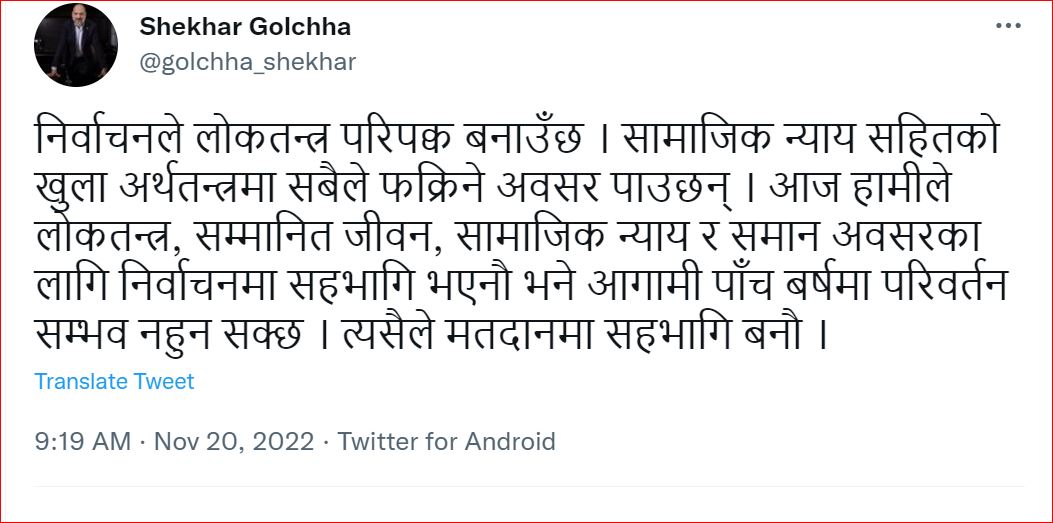 उनले ट्वीटरमा लेखेका छन्, ‘निर्वाचनले लोकतन्त्र परिपक्व बनाउँछ । सामाजिक न्याय सहितको खुला अर्थतन्त्रमा सबैले फक्रिने अवसर पाउछन् । आज हामीले लोकतन्त्र, सम्मानित जीवन, सामाजिक न्याय र समान अवसरका लागि निर्वाचनमा सहभागि भएनौ भने आगामी पाँच बर्षमा परिवर्तन सम्भव नहुन सक्छ । त्यसैले मतदानमा सहभागि बनौ ।’