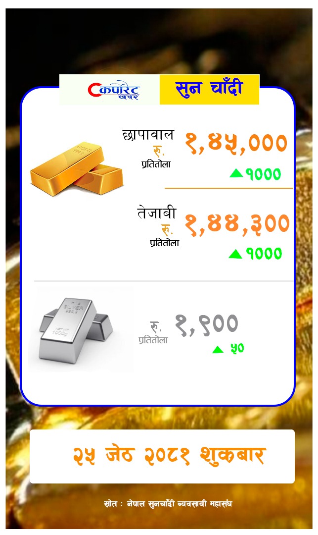 यस्तै, आज तेजावी सुनको मूल्य पनि एक हजार रुपैयाँले बढ्दै प्रतितोला एक लाख ४४ हजार ३०० रुपैयाँ कायम भएको अघिल्लो दिन एक लाख ४३ हजार ३०० रुपैयाँमा कारोबार भएको थियो ।