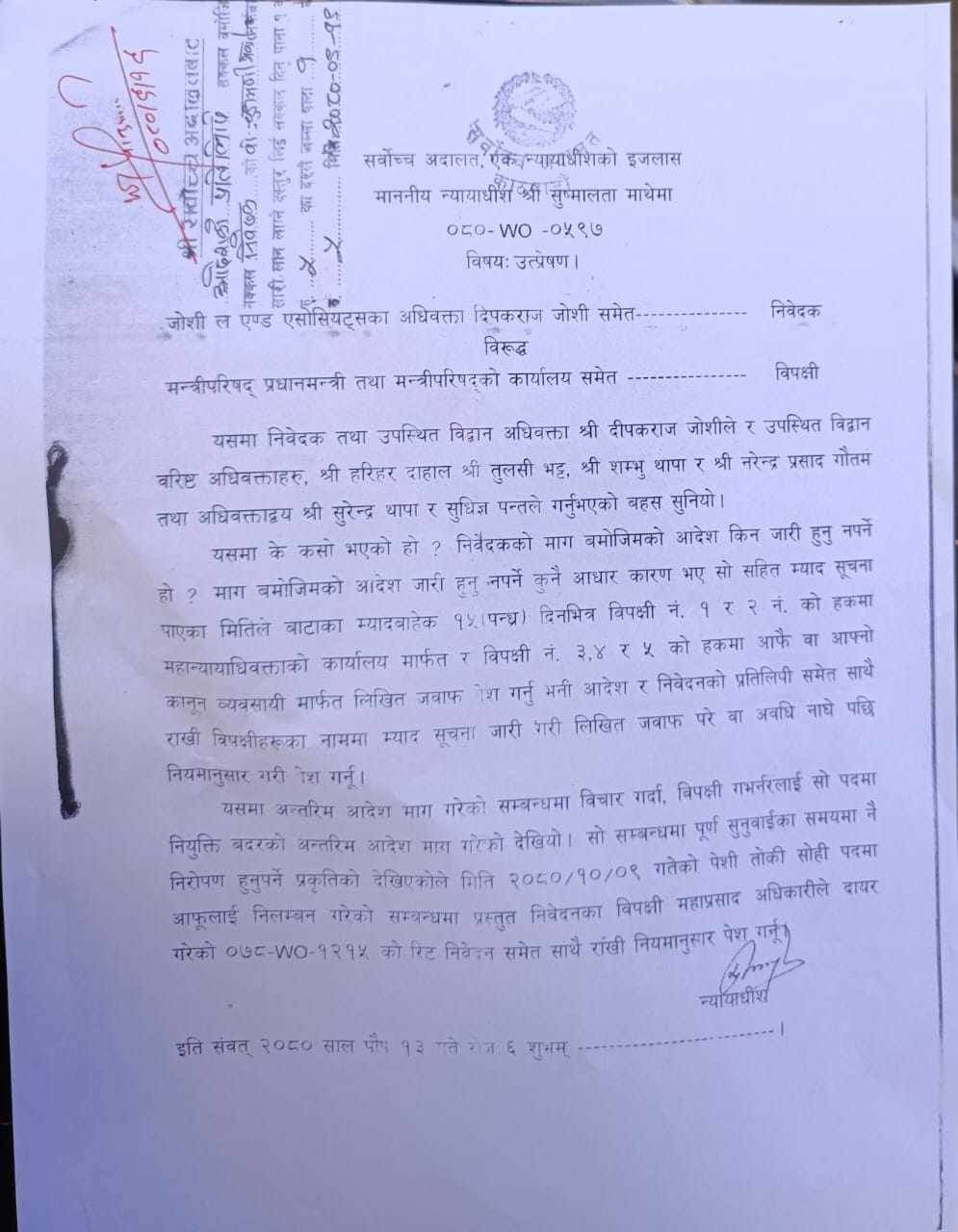 उक्त निर्णयविरुद्ध अधिकारीले दायर गरेको रिटमा २०७९ वैशाख ६ गते सर्वोच्च अदालतका न्यायाधीश हरिप्रसाद फुयालको एकल इजलासले अल्पकालीन अन्तरिम आदेश जारी गरेको थियो ।