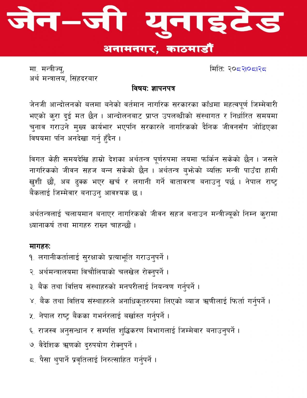 काठमाडौं । जेन जी युनाइटेडले गभर्नर डा. विश्वनाथ पौडेललाई बर्खास्त गर्नुपर्ने माग गर्दै अर्थमन्त्री रामेश्वर खनाललाई ज्ञापनपत्र बुझाएको छ । आइतबार बिहान अर्थमन्त्रालयमा जेन–जी युनाइटेडका संयोजक जनक परियारले ज्ञापनपत्र बुझाएका हुन् ।