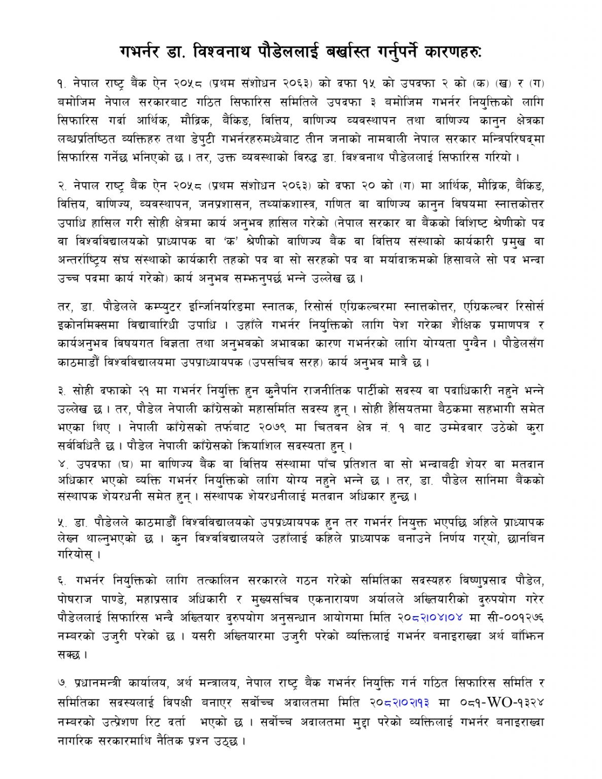 ज्ञापनपत्रमा नेपाल राष्ट्र बैंक ऐनलाई लत्याउँदै तत्कालीन सरकारले पौडेललाई स्वार्थ समूहको डिजाइनमा गभर्नर नियुक्त गरेको दाबी गरिएको छ । त्यस्तै, सरकारले गठन गरेको सिफारिस समितिले अख्तियारीको दुरुपयोग गर्दै पौडेललाई सिफारिस गरेको भन्दै बताउँदै संयोजक परियारले पौडेललाई हटाएर ऐनअनुसार नयाँ गभर्नर नियुक्त गर्न माग गरिएको छ । त्यसैगरी पौडेलले कम्प्युटर इन्जिनियरिङमा स्नातक, एग्रिकल्चरमा स्नात्तकोत्तर गरेको र अनुभवको हिसाबले पनि पौडेलको नियुक्ति राष्ट्र बैंक ऐनको विरुद्ध भएको परियारले बताए ।