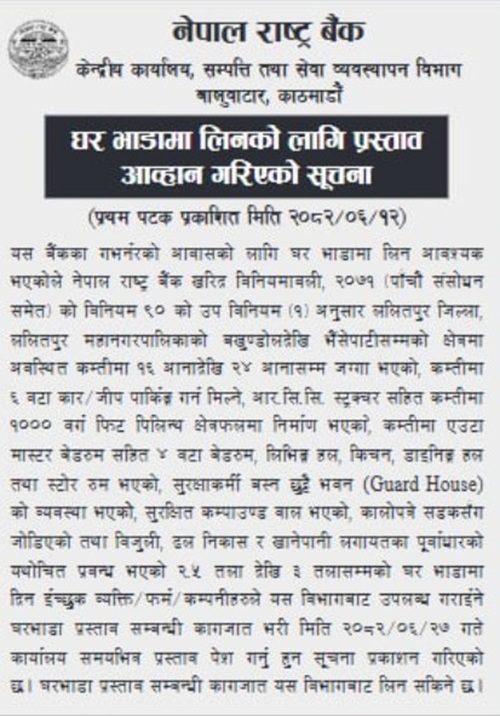 राष्ट्र बैंकको सम्पत्ति तथा सेवा व्यवस्थापन विभागले गोरखापत्रमा सार्वजनिक सूचना जारी गर्दै यस्तो प्रस्ताव माग गरेको हो।