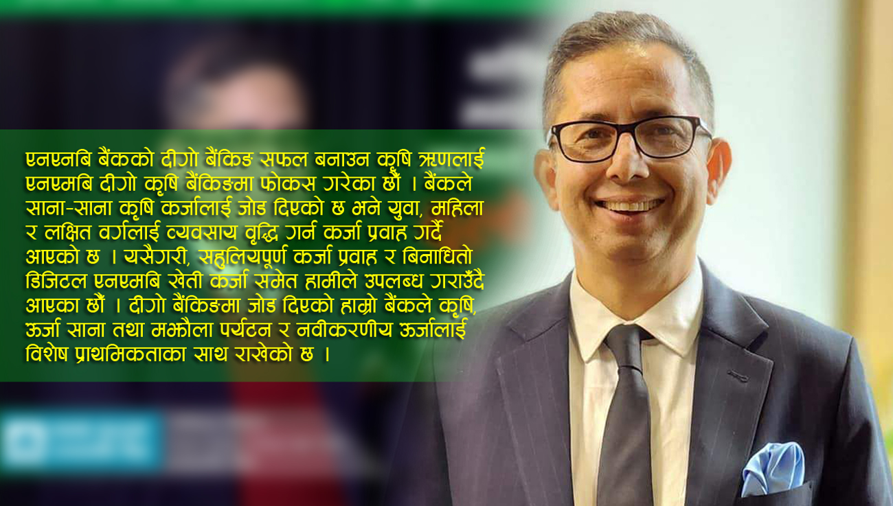 साथै, एनएनबि बैंकको दीगो बैंकिङ्ग सफल बनाउन कृषि ऋणलाई एनएमबि दीगो कृषि बैंकिङ्गमा फोकस गरेका छौँ । बैंकले साना–साना कृषि कर्जालाई जोड दिएको छ भने युवा, महिला र लक्षित वर्गलाई व्यवसाय वृद्धि गर्न कर्जा प्रवाह गर्दै आएको छ । यसैगरी, सहुलियपूर्ण कर्जा प्रवाह र बिनाधितो डिजिटल एनएमबि खेती कर्जा समेत हामीले उपलब्ध गराउँदै आएका छौँ । दीगो बैंकिङमा जोड दिएको हाम्रो बैंकले कृषि, ऊर्जा साना तथा मझौला पर्यटन र नवीकरणीय ऊर्जालाई विशेष प्राथमिकताका साथ राखेको छ ।
