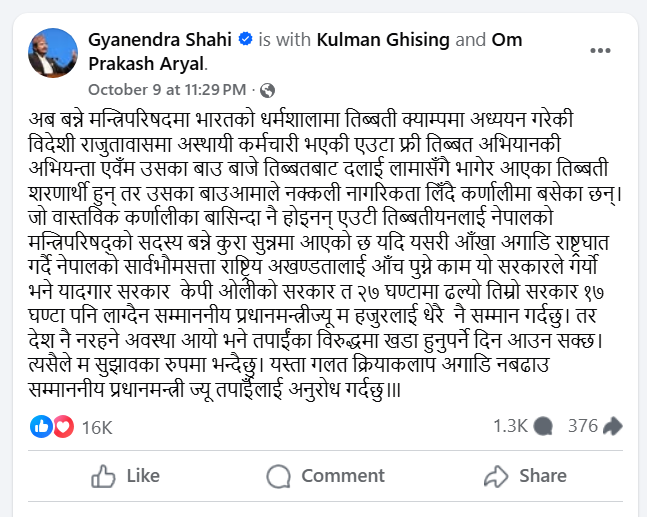 अब बन्ने मन्त्रिपरिषदमा भारतको धर्मशालामा तिब्बती क्याम्पमा अध्ययन गरेकी विदेशी राजूतावासमा अस्थायी कर्मचारी भएकी एउटा फ्री तिब्बत अभियानकी अभियन्ता एवम् उसका बाउबाजे तिब्बतबाट दलाई लामासँगै भागेर आएका तिब्बती शरणार्थी हुन् । तर, उसका बाउआमाले नक्कली नागरिकता लिँदै कर्णालीमा बसेका छन् । जो वास्तविक कर्णालीका बासिन्दा नै होइनन् । एउटी तिब्बतीयनलाई नेपालको मन्त्रिपरिषद्को सदस्य बन्ने कुरा सुन्नमा आएको छ यदि यसरी आँखा अगाडि राष्ट्रघात गर्दै नेपालको सार्वभौमसत्ता राष्ट्रिय अखण्डतालाई आँच पुग्ने काम यो सरकारले गर्यो भने यादगार सरकार केपी ओलीको सरकार त २७ घण्टामा ढल्यो तिम्रो सरकार १७ घण्टा पनि लाग्दैन सम्माननीय प्रधानमन्त्रीज्यू म हजुरलाई धेरै नै सम्मान गर्दछु । तर देश नै नरहने अवस्था आयो भने तपाईंका विरुद्धमा खडा हुनुपर्ने दिन आउन सक्छ । त्यसैले म सुझावका रुपमा भन्दैछु– यस्ता गलत क्रियाकलाप अगाडि नबढाउ सम्माननीय प्रधानमन्त्रीज्यू तपाईँलाई अनुरोध गर्दछु ।