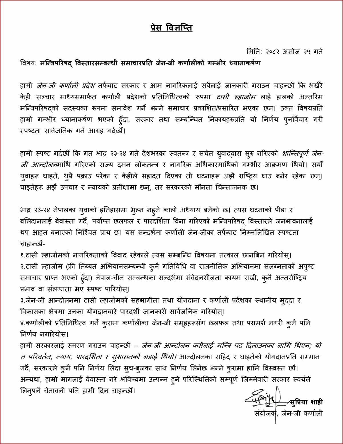 त्यसो त ल्हाजोमलाई मन्त्री बनाउनेसम्बन्धी समाचार शुक्रबार साँझ सार्वजनिक भएलगत्तै जेन्जीका तर्फबाट कर्णालीकी संयोजक सुप्रिया शाहीले विज्ञप्ति नै निकालेर असन्तुष्टि जनाएकी छिन् । जेन्जी आन्दोलनमा कुनै भूमिका निर्वाह नगरेके व्यक्तिलाई मन्त्री बनाउन ठिक नहुने भन्दै उनले फ्रि तिब्बतको अभियन्ता भएको हो भने पनि सरकारले छानविन गर्नुपर्ने माग गरेकी छिन् ।