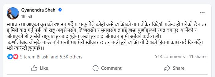 उनका् यसअघिका अभिव्यक्तिबारे प्रकाशित/प्रशारित समाचारप्रति खण्डन गर्दै उनले व्यक्ति तोकेर कसैलाई पनि आफूले लाञ्छित नगरेको स्पष्ट गरेका छन् । ‘समाचारमा आएका कुराको खण्डन गर्दै म भन्छु– मैले कोही कसै व्यक्तिको नाम तोकेर विदेशी एजेन्ट हो भनेको छैन तर हामीले याद गर्नुपर्छ यो राष्ट्र अंग्रेजसँग, तिब्बतसँग र मुगलसँग तपाईँ हाम्रा पुर्खाहरूले रगत बगाएर आर्जेको र जोगाएको हो त्यसैले राष्ट्रघात हुनबाट युक्रेन जस्तो हुनबाट जोगाउन हामी सबैको कर्तव्य हो ।’