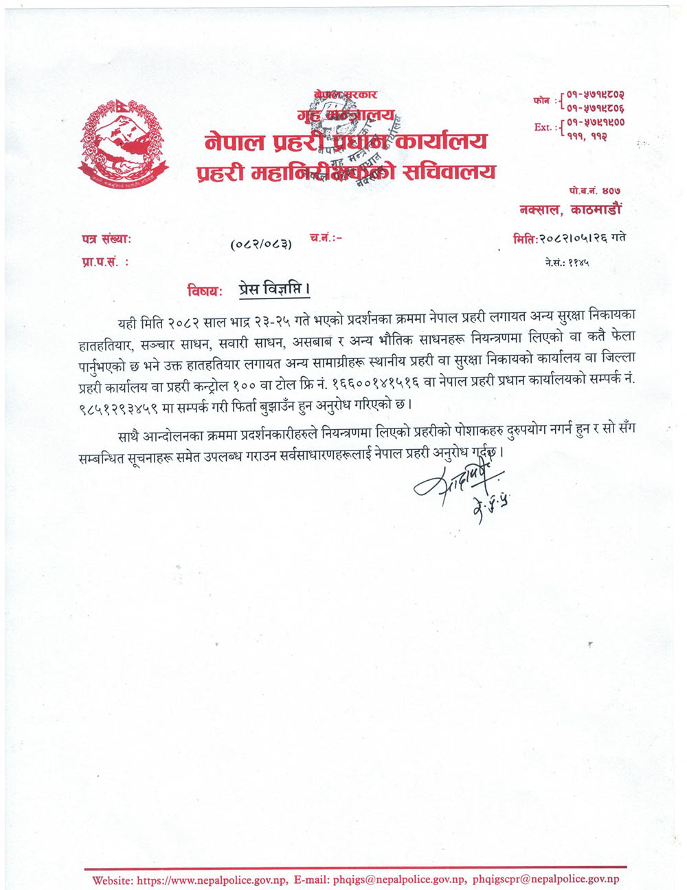 काठमाडौँ । नेपाल प्रहरीले प्रदर्शनका नियन्त्रणमा लिएका हतियार, सञ्चार साधन, सवारी साधन र भौतिक साधनहरु फिर्ता गर्न आग्रह गरेको छ ।