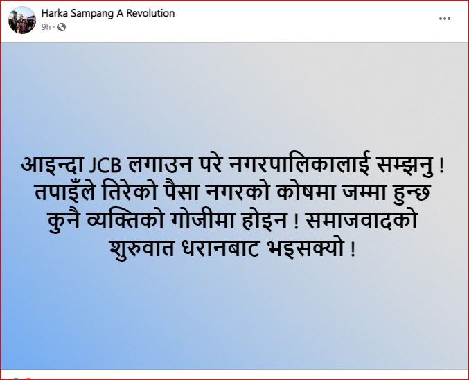उनले फेसबुकमा लेखेका छन्, ‘आइन्दा जेसीबी लगाउन परे नगरपालिकालाई सम्झनु । तपाइँले तिरेको पैसा नगरको कोषमा जम्मा हुन्छ कुनै व्यक्तिको गोजीमा होइन । समाजवादको शुरुवात धरानबाट भइसक्यो ।’