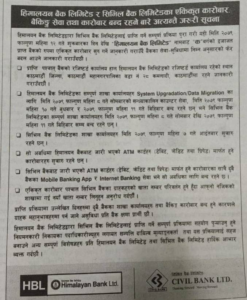 हिमालयन बैंकका सम्पूर्ण शाखा कार्यालयहरु सिस्टम अपग्रेसन तथा डेटा माईग्रेसनका लागि फागुन ८ गते सन्ध्याकालिन काउन्टर सेवा, १० गते बुधबार र १५ गते बिहीबा बन्द रहने बैंकले बताएको छ ।