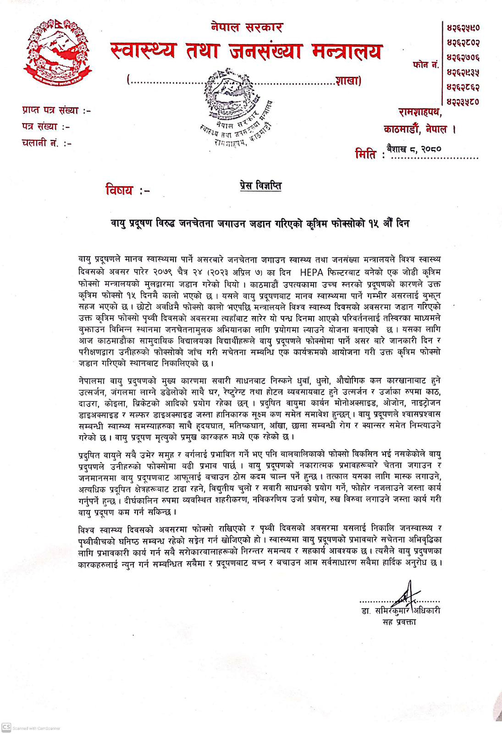 वायु प्रदूषणले मानव स्वास्थ्यमा पार्ने असरबारे जनचेतना जगाउन स्वास्थ्य तथा जनसंख्या मन्त्रालयले विश्व स्वास्थ्य दिवसको अवसर पारेर २०७९ चैत्र का दिन हेपा फिल्टरबाट बनेको एक जोडी कृत्रिम फोक्सो मन्त्रालयको मुलद्वारमा जडान गरेको थियो ।’