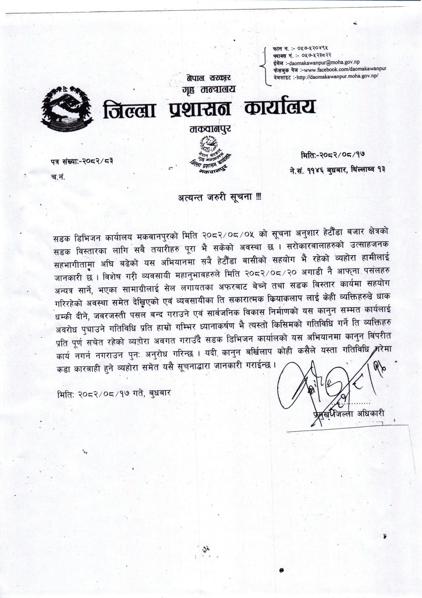 हेटौडा । जिल्ला प्रशासन कार्यालय, मकवानपुरले हेटौडाको बजार क्षेत्रमा सडक विस्तार हुने भएकाले मङ्सिर २० गतेसम्म सडकमा पर्ने घरहरु खाली गर्न सूचना जारी गरेको छ ।