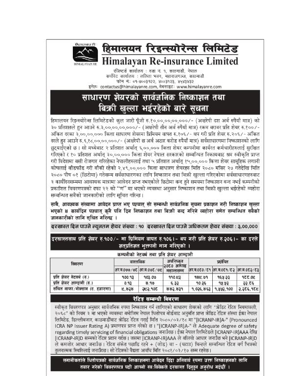 कम्पनीले १०६ रुपैयाँ प्रिमियम थप गरी २०६ रुपैयाँ मूल्यमा जारी पुँजीको ३० प्रतिशत अर्थात् ३ अर्ब रुपैयाँ बराबरको आईपीओ निष्काशन गरेको हो । वैदेशिक रोजगारमा गएका कामदार र म्युचुअल फन्डलाई बाँडफाँड गरेर सर्वसाधारणका लागि आवेदन खुला गरिएको हो ।