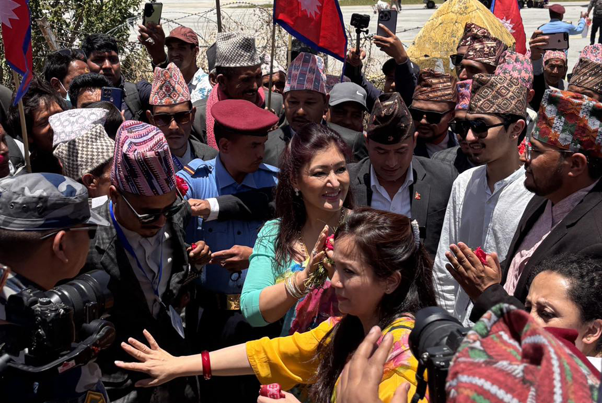 काठमाडौं । राजसंस्था र हिन्दुराष्ट्र पुनर्स्थापनाको पक्षमा गतिविधि बढिरहेका बेला पूर्वयुवराज्ञी हिमानी शाह र उनका सुपुत्र पूर्वनवयुवराज हृदयेन्द्र शाह जुम्ला पुगेका छन् । आज शनिबार जुम्ला गएका उनीहरूलाई समर्थकहरूले विमानस्थलमा बाजागाजा र नाराबाजीसहित भव्य स्वागत गरेका छन् ।