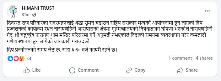 ट्रष्टले आज आइतबार साँझ फेसबुकमा लेख्दै भनेको छ, ‘दिवङ्गत राज परिवारका सदस्यहरुलाई श्रद्धासुमन चढाउन राष्ट्रिय सरोकार मञ्चको आयोजनामा हुन लागेको दीप प्रज्वलनको कार्यक्रम स्थल नारायणहिटी आसपासका क्षेत्रमा गृहमन्त्रालयको निषेधाज्ञाको घोषणा भएकोले नारायणहिटी गेट, श्री चतुर्ब्यूह नारायण धाम मन्दिर परिसरमा गर्ने अनुमति नभएकाले विदाको समयमा व्यवस्थापन गरेर कमलादी गणेश स्थानमा हुन लागेको जानकारी गराउँदछौँ । दीप प्रज्ज्वलनको समय जेठ १९ साझ ६ः३० बजे कायमै रहने छ ।’